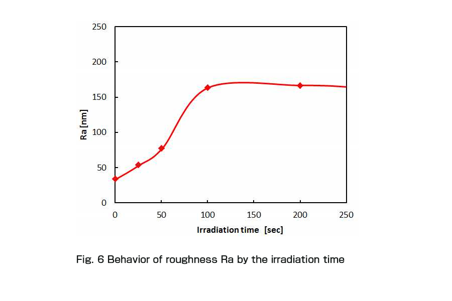 図6はVUV光照射時間とフォトデスミア後の表面粗さをAFMにより測定した結果を示す。VUV光の照射によって、表面粗さは上昇していくが、UVレーザーでのデスミアでは、必要照射量が少ないので、粗くなりすぎる前にスミア除去のプロセスは終了することができる。この実験結果は照射時間によって粗さを制御することを意味する。