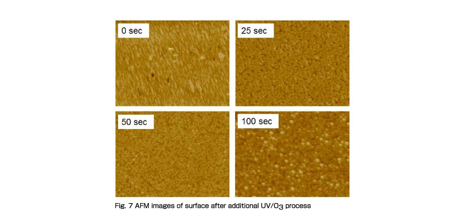 図7は上記照射水準でのAFM像である。100秒照射ではフィラーが露出しており、密着性の低下が予想されるが、50秒程度までは表面樹脂の分解にとどまっており、ある程度のプロセスの自由度が予想できる。
