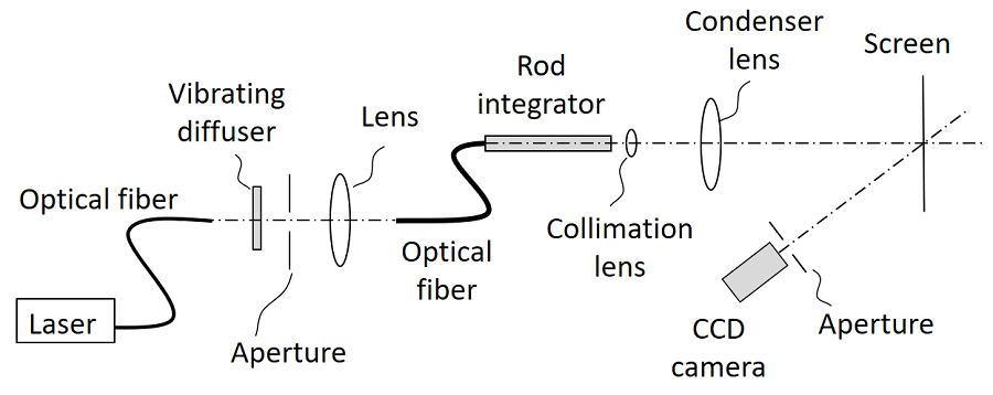 まず,Fig. 1に示した実験系を用いて角度多重によるスペックル低減の実験を行った.レーザー光は振動拡散板で拡散された後,光ファイバーに半角0.3 rad程度で入射し,ロッドインテグレータ内で均一化した.ロッドインテグレータの端面像をシルバースクリーン(Finesilver 240,菊池科学研究所)に投影し,CCDカメラ(BS-44DUV,ビットラン株式会社)を用いてスペックルの測定を行った.