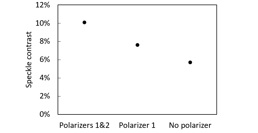 偏光子を使用しなかった場合,偏光子1のみ使用した場合,偏光子1と2を使用した場合についてそれぞれスペックルを測定した結果をFig. 10に示す.偏光子1と2を両方使用した場合と,偏光子1のみ使用した場合を比較すると,偏光子1によってスクリーン入射光を直線偏光とした場合には,偏光子2の有無によってスペックルコントラストが変化していることがわかる.つまり,スクリーンでの偏光解消によってスペックルが低減している.また,偏光子2を使用せずスクリーンでの偏光解消によってスペックルが低減している場合についても,偏光子1の有無によってスペックルコントラストが変化している.したがって,マットスクリーンでは入射光の偏光状態によるスペックル低減とスクリーンでの偏光解消の両方によってスペックルが低減することがわかる.