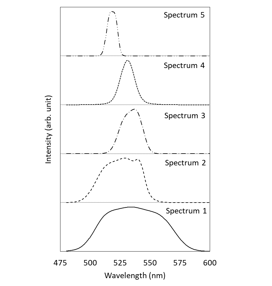 Fig. 4は緑色の画像を入力した場合にプロジェクターから出射される光のスペクトルを示す.スペクトルの測定には分光器(HR2000,Ocean Optics Inc.)を用いた.Fig. 4のスペクトル1はプロジェクターから出射された光をそのまま分光器に取り込んだ場合のスペクトル,スペクトル2~5はバンドパスフィルターを用いてスペクトルを狭窄化した場合のスペクトルである.Table 1に各々のスペクトルのスペクトル幅を示す.