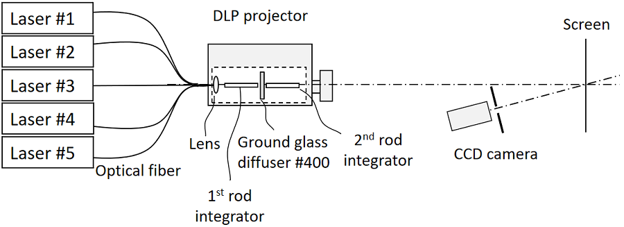 Fig. 5に示すように,XeランププロジェクターからXeランプを取り除き,代わりに光ファイバー,レンズ,ロッドインテグレータ,拡散板を追加し,拡散板を透過した光がプロジェクターにもともと配置されていたロッドインテグレータに入射するように配置した.レーザーは,波長幅が0.1 nm~0.2 nm程度のSHGレーザーを用い,6~7 nm間隔で1波長~5波 長(523.9 nm,530.1 nm,536.4 nm,543.9 nm,550.1 nm)用いた場合について測定を行った.画像サイズ,スクリーン・カメラ間の距離,カメラ前のアパチャーサイズはXeランプを用いた場合と同じ値を用いた.