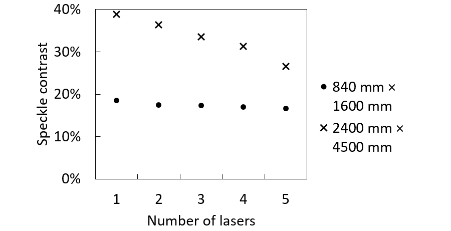 Fig. 6にスペックルコントラストの測定結果を示す.レーザーを5波長用いた場合は,レーザーを1波長のみ用いた場合に比べてスペックルコントラストは顕著に低下していることがわかった.