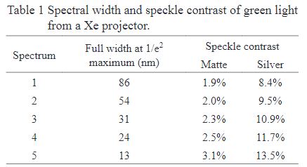 スペックルコントラストの測定結果をTable 1に示す.マットスクリーン・シルバースクリーンともにスペクトル幅が狭くなるとスペックルコントラストが上昇していることがわかる.スペクトル幅(1/e2全幅)を86 nmから13 nmまで狭窄化することで,シルバースクリーン,マットスクリーンともに6割程度スペックルコントラストが増加することが確認された.