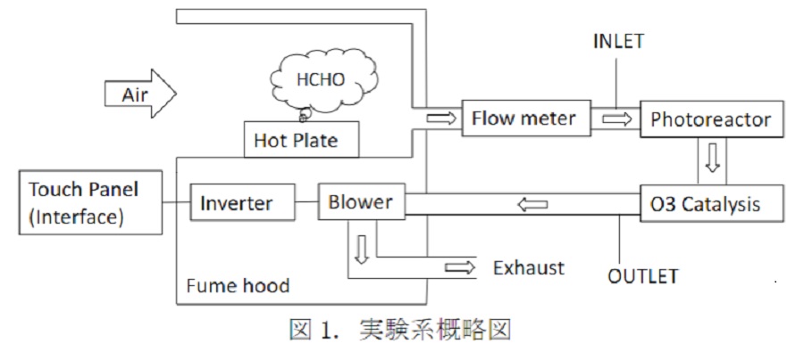 図1.に実験系の概略図を示す。実験系はエキシマランプを搭載したリアクター(XOR-CO1-Z2, ウシオ電機株式会社)、ヒュームフード(MHT-0706STAC, 昭和電機株式会社)、オゾン分解触媒(NHC-453, 日揮ユニバーサル株式会社)で構成されており、各構成要素がφ100のアルミダクトで連結されている。リアクターに搭載したランプは13.2Wタイプ(UXFL95-172F-Z1, ウシオ電機株式会社)と250Wタイプ(UXFL540-172UI-Z, ウシオ電機株式会社)の2通りである。ホルムアルデヒドガスはパラホルムアルデヒドをホットプレート(RSH-1DN, アズワン株式会社)で加熱気化させることによって所定の濃度が得られるよう温度と投入量を調整した。