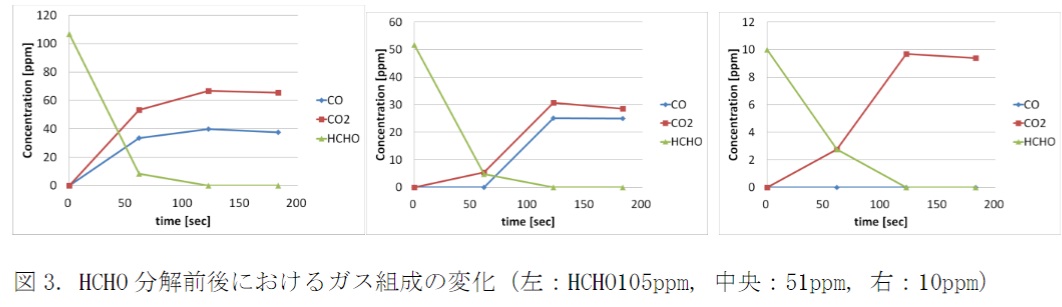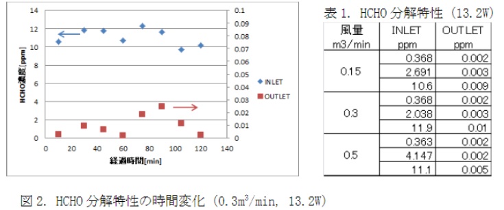 上述した化学反応により分解されるとすると、分解前後においてHCHO濃度とCO+CO2濃度は炭素の収支から考えて等しくなる。図3.より、上記が成り立っていることが確認できる。COが出ないよう流量とランプ電力を考慮して設計すれば、最終生成物はCO2とH2Oだけとなり、有害物質を無害化するダクトレス換気装置として使用することができる。電気効率の点からも13.2Wのランプで0.5m3/minの処理が可能なため、3m3/min程度の小型の換気装置であれば、分解に必要な電力は80W程度で動作させることが可能である。