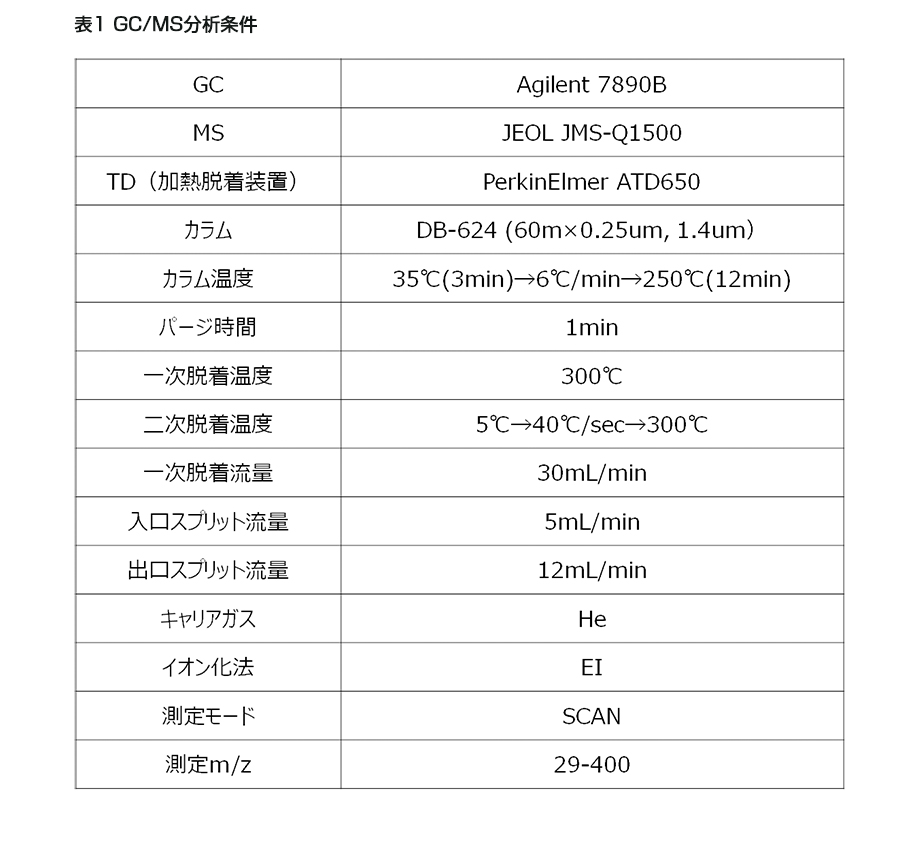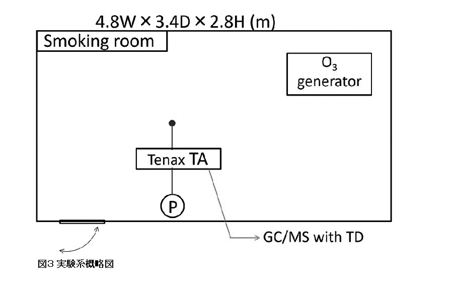 実験場所は当社播磨工場の喫煙室(45.7 m3)を使用した。工場終業後に喫煙室を無人とし、1時間換気した後にエキシマランプ式オゾン発生器(XEFIRIA、O3発生量1,000 mg/h、ウシオ電機㈱)、放電式オゾン発生器(GWD-1000FR、O3発生量1000 mg/h、オーニット㈱)を設置した。換気扇を停止させた後にそれぞれオゾン発生を30 min行い、その後30 min放置することで室内のオゾンを自然分解し脱臭処理を行った。なお、室内のオゾンは残留せず、自然分解した。処理前後の室内空気を吸着管(Tenax TA60/80 150 mg)にサンプリングポンプ(GSP-400FT、ガステック㈱)を用いて流速0.5 L/minで10分間捕集を行い、加熱脱着装置(TD)付GC/MSにて分析を行った。