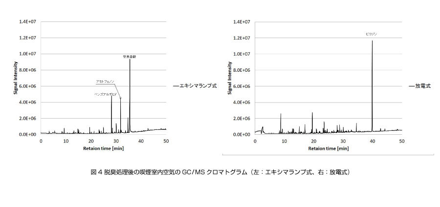 喫煙室の空気の脱臭処理において、オゾン発生方式の違い、放電式とエキシマランプ式では処理後に生成される物質が異なり、官能評価に差が現れた。処理後の特徴的な生成物は、それぞれピリジンと安息香酸であった。
