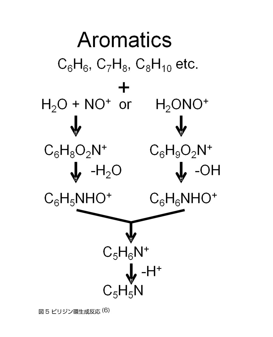 ピリジン生成の由来は図5に示すように窒素分子を含む大気の放電によって生成されるNOが芳香族化合物と反応して最終的にピリジンとなることが報告されている(6)。紙巻タバコの煙には942 μg/本程度のベンゼン、トルエンなど芳香族化合物が含まれている(7)。実際に今回の脱臭処理前後の分析結果ではトルエン、ベンゼン、p-キシレンといった芳香族化合物が検出されている。今回実験で使用した喫煙室で実験前にタバコが何本吸われたか、また内壁面にいったん付着した物質が再揮発した程度は不明であるので、今後はさらなる定量的な計測が必要である。