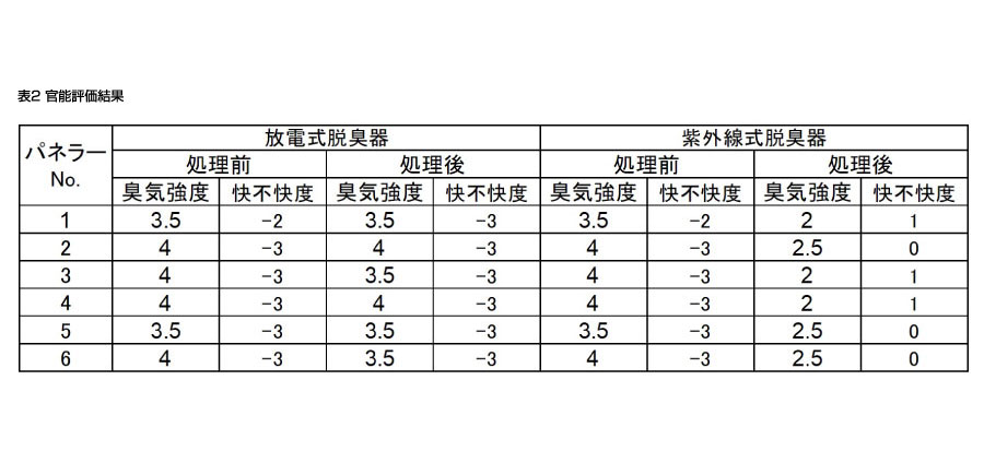 表2にパネラー6名による官能評価結果を示す。パネラーは20~50代男性、非喫煙者である。エキシマランプ式オゾン発生器の使用前後で、臭気強度指数が-1.6ポイント、快不快指数が+3.3ポイント変化した。一方、放電式オゾン発生器の使用前後で、臭気強度指数と快不快指数がそれぞれ-0.2ポイント変化した。パネラーには臭気強度、快不快度指数の記載とともに臭気変化に対するコメントも記載頂いた。それによるとエキシマランプ式では「ニオイは若干するが不快ではない」という生器はタバコのにおいが取れていないというわけではなく、6名のパネラー全員が「ニオイの強さは変わらない又は強さの変化はそれほどわからないがニオイの質が変わった」、という回答であった。GC/MS分析、官能評価ともにオゾン発生方式による違いがあった。
