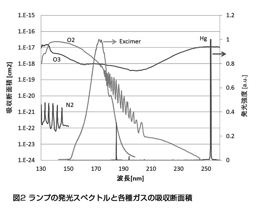 図2に示すエキシマランプと低圧水銀ランプの発光スペクトル、ならびに酸素、オゾン、窒素の吸収スペクトルを比較すると、172 nmにおける酸素分子の吸収断面積は185 nmに比べ56倍程度高いので、酸素原子生成効率は高い。一方、172 nmにおけるオゾンの吸収断面積は254 nmに比べ12倍程度低いので、オゾン分解効率が低い。このため入力電力あたりのオゾン発生効率は、エキシマランプが低圧水銀ランプと比較して50倍以上高くなる。