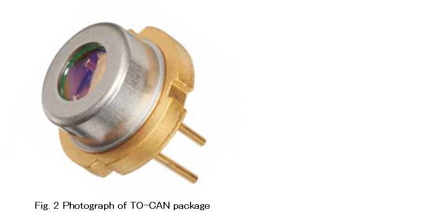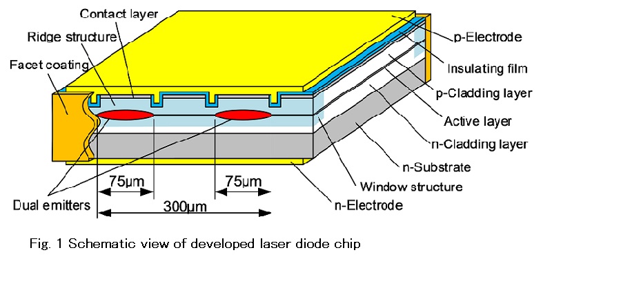 Fig.1に今回開発したLDチップ構造図を示す.本チップは二つの発光部(2エミッタ)を有するモノリシックチップであり,各エミッタ幅を75 mm,共振器長を1500 mmとした.共振器の前後端面には窓構造を設け,保護膜を成膜した.導波路にはリッジ構造を採用し,電流・光損失の低減を図った.638nm LDと642nm LDは,いずれもGaAs基板上にAlGaInP系の材料を結晶成長したヘテロ構造であり,活性層に歪量子井戸を備えている.AlGaInP系赤色LDでは,高温動作時に活性層からPクラッド層へ電子のオーバーフローが生じ,光出力が飽和することが最大の課題である.今回開発したLDチップは,電子のオーバーフローを抑制する為,チップの放熱性を改善した.LDチップはFig.2に示す9.0mmφTO-CANパッケージにジャンクションダウンで実装した.