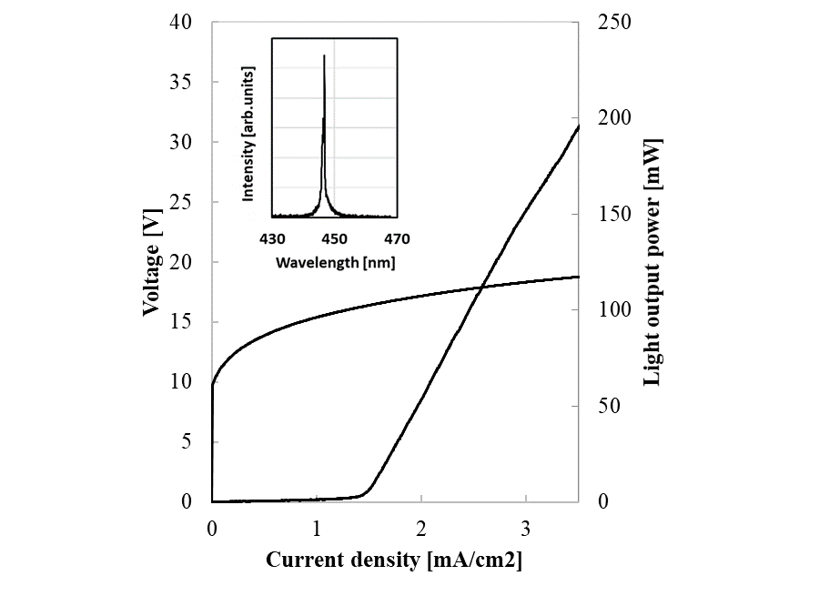 図3にパルス駆動時のJ-V-L特性を示す。波長447nm、しきい値電流密度1.5kA/cm2での発振が確認された。我々の知る限り、MOVPEで作製された下部トンネル接合LDの初めてのレーザ動作である。一方、劈開ミラーでのスロープ効率は0.42W/Aと、我々が作製した従来のpn接合LD(約0.8W/A)と比べて低く、注入効率の改善は見られていない。また、立ち上がり電圧も10Vと高く、トンネル接合の低抵抗化も必要である。