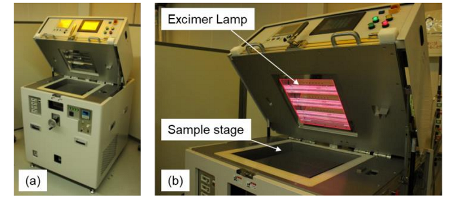 一方,エキシマランプは,中心波長 172nm などの真空紫外光(VUV:Vaccum ultra violet)を照射し,雰囲気中の酸素との反応で,酸素系ラジカルを発生させ, 材料表面の洗浄・改質を行う。