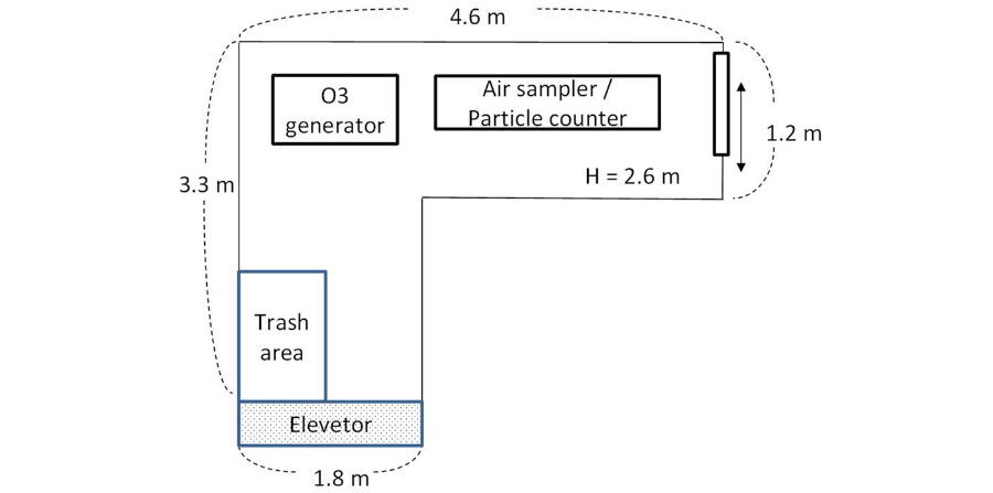 また、フィールドテストとして、姫路市の社会福祉法人「幸なごみの里」内の汚物処理室26.8 m3(Fig.1)にてチャンバー実験と同じ器材を用いて現場検証を行った。この際、日鉄テクノロジー株式会社にてエアーサンプラー(LV-250, 柴田科学(株))で5 m3の雰囲気を捕集し、エアロゾルの濃度、形状、成分分析を行って頂いた。