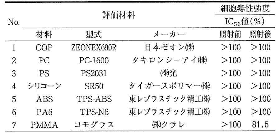 表2. 172 nm光を照射した合成高分子材料の細胞毒性試験結果