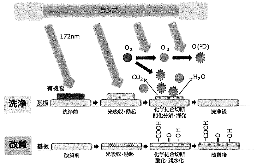 短波長の172 nm光は7.2 eV (166.7 kcal/mol)の高いフォトンエネルギーを有する。有機物に172 nm光を照射すると,有機物中のC-CやC-O結合を効率的に切断する。