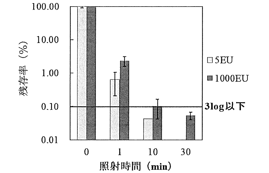 エンドトキシン汚染はグラム陰性細菌の混入により発生する。エンドトキシン汚染の実態を反映させた評価として,大腸菌乾燥死菌体( 250 ng)をガラス板に塗布して照射実験を行った。その結果,菌体レベルのリムルス活性は10分間及び60分間の照射により,それぞれ2桁, 3桁以上減少した(図7)。