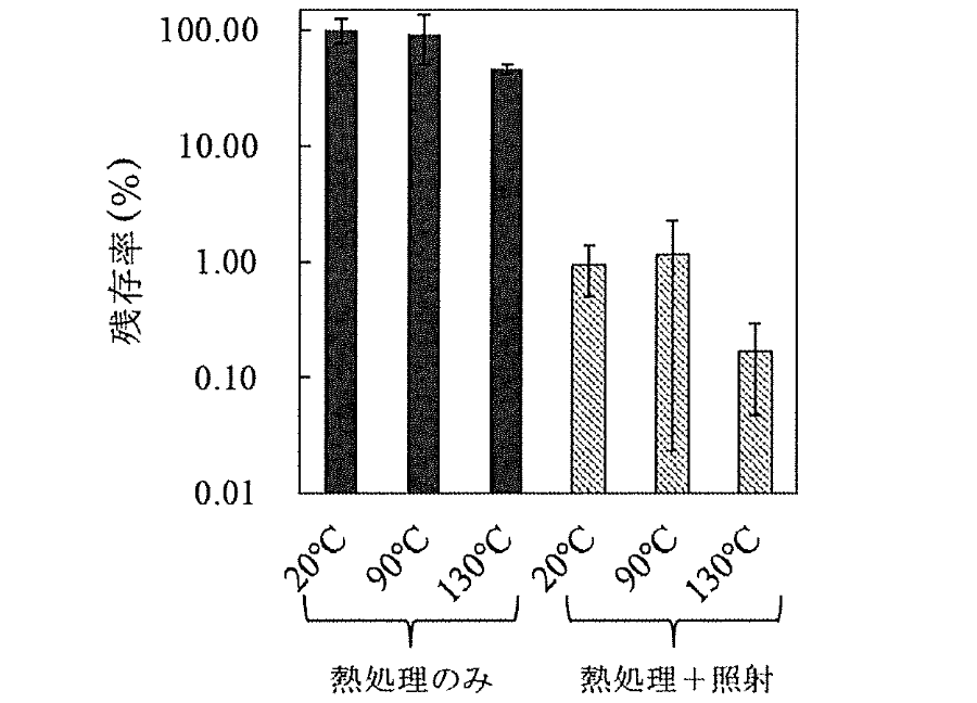 菌体レベルのエンドトキシンも172 nm光を照射することにより顕著に不活化されたが,精製エンドトキシンと比較して, 3桁減少に到達するまで,より多くの時間を要した。これは,乾燥死菌体に存在するタンパク質や核酸等,エンドトキシン以外の菌体成分の分解にも, 172 nm光が消費されたことに起因すると考えられる。