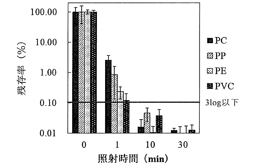 実製品への適用を想定した評価として,種々の合成高分子材料上にエンドトキシン(100 EU)を塗布して照射実験を行った。基材としては, 1 cm角のPC, PP, PE, PVCを用いた。各試験片はエタノール及び注射用水中で順次超音波洗浄した後に試験に供した。その結果,ガラス板上に塗布した場合と同様,精製エンドトキシンのリムルス活性は基材の種類を問わす, 10分間の照射処理により3桁以上低下することが確認された(図8)。