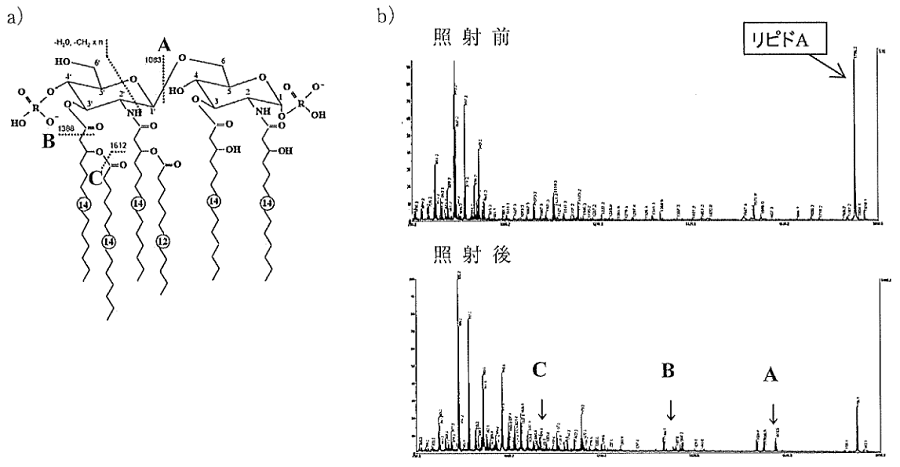 a)リピドAの分子構造と光照射による切断箇所, b)照射前後のMALDI-MSスペクトル。横軸:m/z, 縦軸:相対イオン強度。