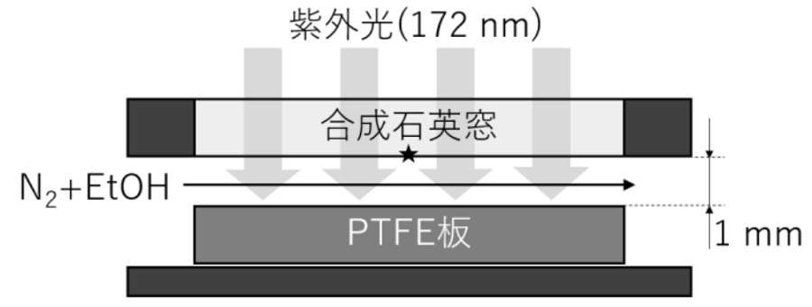 PTFE板を2-プロパノールおよび純水により洗浄後,窒素ブローにより乾燥したのち,処理室内に置いた。窒素(純度99.9995 %以上)を流量2 L/minでエタノール(富士フイルム和光純薬)15 mLに通してバブリングし,処理室内をパージした。パージを続けながら,小型エキシマ照射装置HPV-ST(ウシオ電機)によって図1のように波長172 nmの紫外光を所定の時間だけ照射したのち,PTFE板を取り出した。