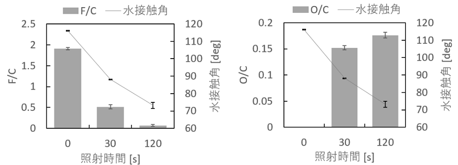 未処理のPTFE板と,VUV+EtOH処理を30秒間,120秒間行ったPTFE板について,水接触角測定とX線光電子分光(XPS)の結果を図2に示す。XPSでは表層数nmの化学状態が取得される2)。VUV+EtOH処理を120秒行ったことで,少なくとも表層数nmのF原子濃度が大きく減少し,O原子濃度が増加する。これはPTFE分子中のF原子の脱離および親水性官能基の形成によるもので,これらの変化にともなって水接触角も減少したと考えられる。
