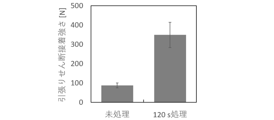 次に,引張りせん断接着強さ試験の結果を図4に示す。未処理のPTFE板では引張せん断接着強さが87±13 Nであったのに対し, VUV+EtOH処理を120秒行ったPTFE板では349±66 Nとなった。接着強度の大幅な向上の理由の一つとして親水性官能基の生成が考えられる。表面の物理的な形状も接着強度に影響するので,今後VUV+EtOH処理を行ったPTFE板についてSEMまたはAFMによる観察を行う予定である。