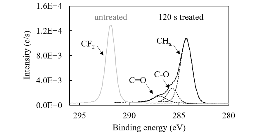 Figure 2 shows the XPS spectra of the PTFE surface before and after 120-s irradiation under ethanol vapor. XPS shows the chemical state of a few-nm depth of the surface layer. 120-s treatment removed almost all F atoms from the surface layer, forming a hydrocarbon layer that contains hydrophilic functional groups such as OH and C=O. The OH groups originate directly from the photolysis of ethanol. The C=O groups are generated by the oxidation of C–OH by O atoms or OH radicals, which are produced by the photolysis of a trace amount of residual O2 and H2O in the reactor.