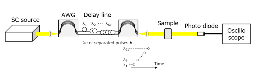 赤外分光法は分子振動スペクトルを非破壊・非接触で計測できる手法であり、試料の化学種同定における強力なツールである。分子結合の倍音や結合音を観測する近赤外分光法は、多変量解析を用いることで複雑なスペクトルから有意な情報を得ることができ、試料の水分含有量や糖度測定などへ応用されている。可視・赤外光より高深達、高SNR測定可能な特徴を活かし、食品や化学分野での全数検査への応用が期待されている。現在近赤外分光で主流のFT-NIR装置はスペクトル取得に1 s程度かかる。超高速にスペクトルを測定する手法としてパルス伸長分光法が研究されている。分散素子を用いてパルス光をチャープさせ、フォトダイオード等でその時間波形を取得することで高速にスペクトル測定ができる。これまでに光ファイバの色分散[1]や回折格子と非平行ミラー対を用いた手法[2]により10 MHzを超える高速レートでのスペクトル測定が実現されている。しかし超高速な一方、出力制限や装置が大型化するといった課題があり、高速全数検査への応用はまだ実現できていない。