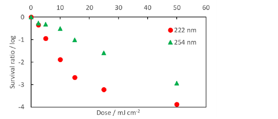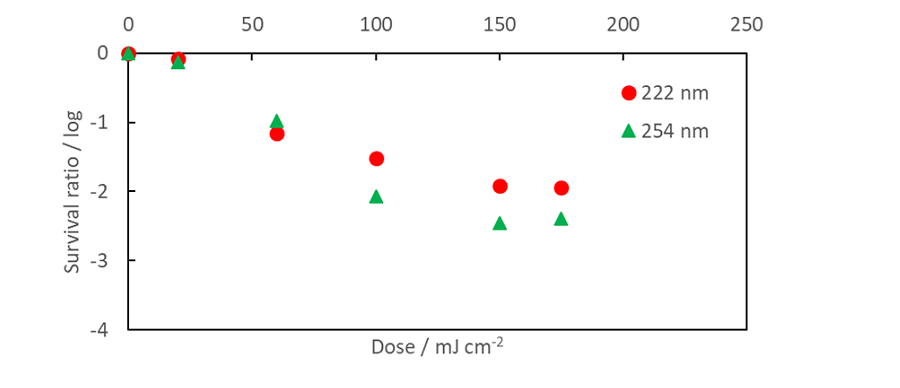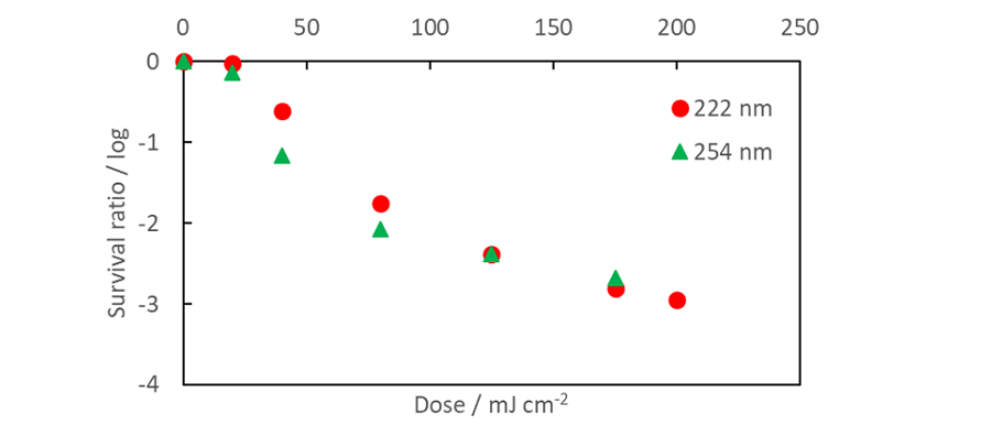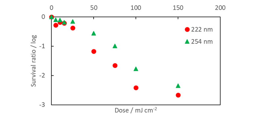 不活化効果は、試験液をφ35 mmの滅菌されたプラスチックシャーレに3 mL投入し、紫外線を所定量照射したのちに回収、寒天培地に0.1 mL塗抹したのち所定条件で培養し、コロニー数を計測することで算出した。使用した照射光源は222 nmエキシマランプ(UXFL70-222B4-UIA、ウシオ電機)及び254 nm殺菌灯(SUV-6、アズワン)で、それぞれ液面における照度は0.1 mW/cm2とした。