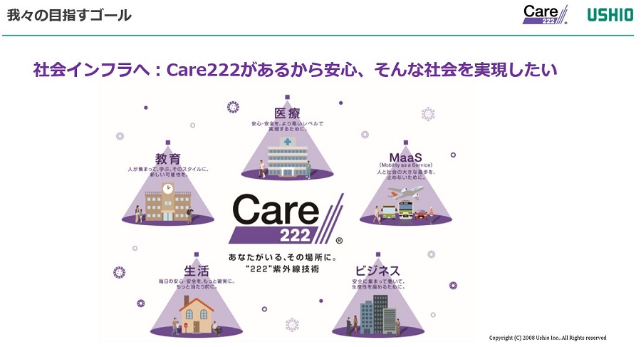 波長222nmの紫外線を殺菌に利用するCare222®が、SDGsの目標3に掲げられている「すべての人に健康と福祉を」を達成する一助となり、今後起こるかもしれない感染症への対処に寄与できることを期待するとともに、当社のこの技術が照明器具を始めとして様々な器具に搭載され、Care222®があるから安心、そういった社会が実現できることを強く願っている。