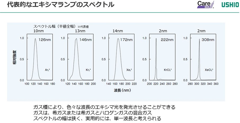 放電用ガスとして希ガス或いは希ガスとハロゲンガスの混合ガスを用いると、ガス種により色々な波長のエキシマ光を発光させることが可能である。これら各エキシマランプの分光スペクトルを図2に示す[1]。