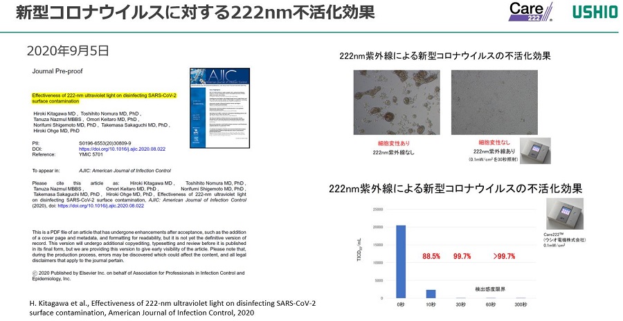 さらに、波長222nm紫外線は、エアロゾル中のヒトインフルエンザやヒトコロナウイルスに対しても、高い不活化効果を示すことが報告[9][10]されており、最近では新型コロナウイルス(SARS-Cov-2)に関する不活化効果の検証が行われ、広島大学の大毛教授らの研究グループにより、その成果が報告されている[11][12]。