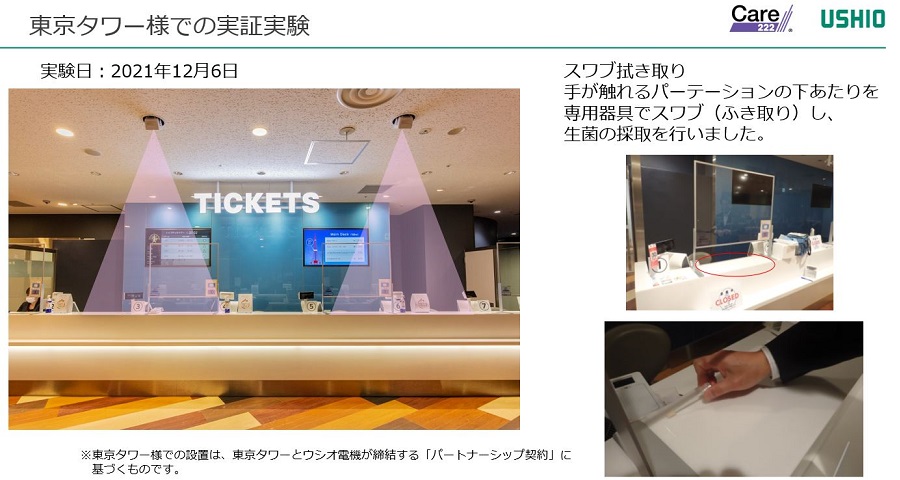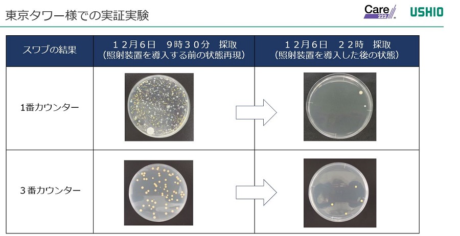 当社では実際にCare222®技術を搭載した器具を施設に取り付け、現地で実地検証を行っている。当社とパートナーシップ契約を締結している株式会社東京タワー様にご協力をいただき、チケットカウンター天井に取り付けた器具を用いて効果検証を実施した。照射前後で専用器具を用いて拭き取りを行い、生菌の採取を行い、その効果を確認したところ、およそ12時間の稼働において多くの生菌が減少していることが観察され、波長222nmの紫外線による除菌効果が実証された(図8)。