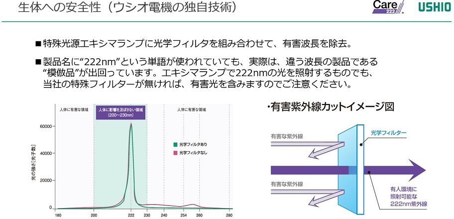 本稿で紹介する抗ウイルス・除菌用紫外線技術「Care222®」は、まさにこの考え方に基づき、なんとか社会の役に立ちたいと考え、将来に向けてのウイルス対策として開発を進めたものである。光を使うという特性から、物の表面と紫外線が当たったところの空気を同時に除菌できるという特長を持ち、かつ人体に悪影響を及ぼさずに使用することが可能となった。