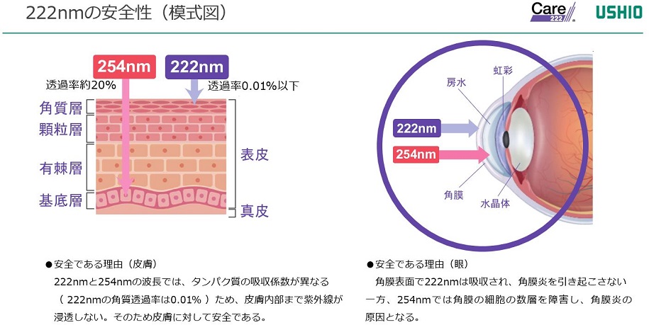 波長222nmの紫外線が整体に殆ど障害を与えなかった大きな理由として、波長222nm紫外線の生体に対する深達度の浅さによるものであることが、神戸大学の錦織教授らのグループの研究によって詳細報告がなされている[5][6]。通常、皮膚においては、従来の紫外線が皮膚の表皮の基底層にまで到達し、細胞やDNAを損傷させるのに対し、波長222nmの紫外線は角質層という極めて表層部分までしか到達しないため、表皮細胞のDNAをほとんど損傷しないことが明らかになった(図4)。一方、眼への波長222nmの安全性に対しても、島根大学の谷戸教授らのグループから論文が報告[7]され、角膜への影響が認められないことが明らかになっている(図4、図5)。