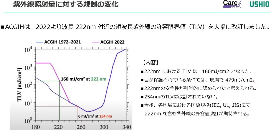 波長222nm 紫外線の生体に対する高い安全性と,広範囲な細菌やウイルスに対する高い不活化効果は,波長 222 nm 紫外光源が様々な場面において応用が可能であることを示している。このような科学的知見の蓄積もあり,2021 年にアメリカ合衆国産業衛生専門官会議(ACGIH)において,UVC 波長領域を中心とした曝露勧告値(TLV)の改定提言がなされ,波長222 nm の紫外線では目および皮膚のそれぞれで曝露勧告値の大幅な引き上げることが採択された[13]。今後,器具搭載時の工業会規格などでの議論が進み、波長222nmの紫外線の適用範囲や有用性が更に広まっていくことが期待される。