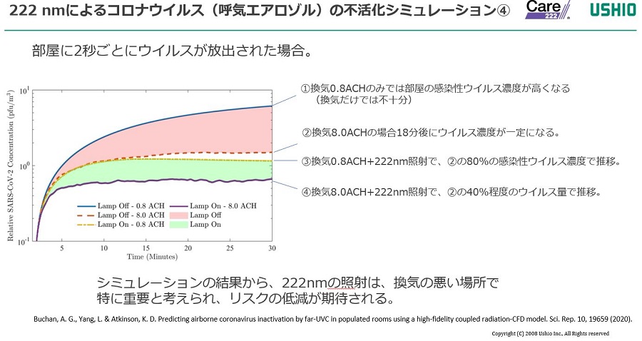 上述にて示される表面の付着菌に対する効果だけでなく、感染経路として疑われるエアロゾル中の新型コロナウイルスに関しても,波長222 nm による不活化効果があると考えられる。そこで,前述の222 nm 紫外光源を使ったコロナウイルスの不活化研究の実験データをもとに,患者が在室時(部屋の大きさ3 × 3 × 3 m)のコロナウイルス(エアロゾル)の不活化効果を数値化した流体シミュレーションモデルによる解析結果が報告されている[14]。このモデルにおいては,部屋の換気(一時間当たり8 回の換気)のみと比較して,ヒトに対する曝露勧告値(ACGIH TLV 22 m J/cm2)の条件で222 nm 紫外光源を使用すると,感染性コロナウイルスの低減効率が約2 倍程度まで上がることが見積もられた。また,換気がほとんど行われない部屋において222 nm 紫外光源を使用する事により,一時間当たり8 回の換気を行った場合と同程度まで,感染性コロナウイルスの量を低下できる事が見積もられており,リスク低減の可能性が報告されている。