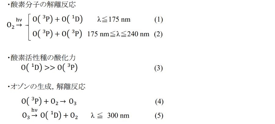 図中の(5)式に関して、オゾンの光解離の波長域値は300 nmではありませんが、オゾンの吸光係数を加味した実質的な閾値の目安として300 nmと記載しています。