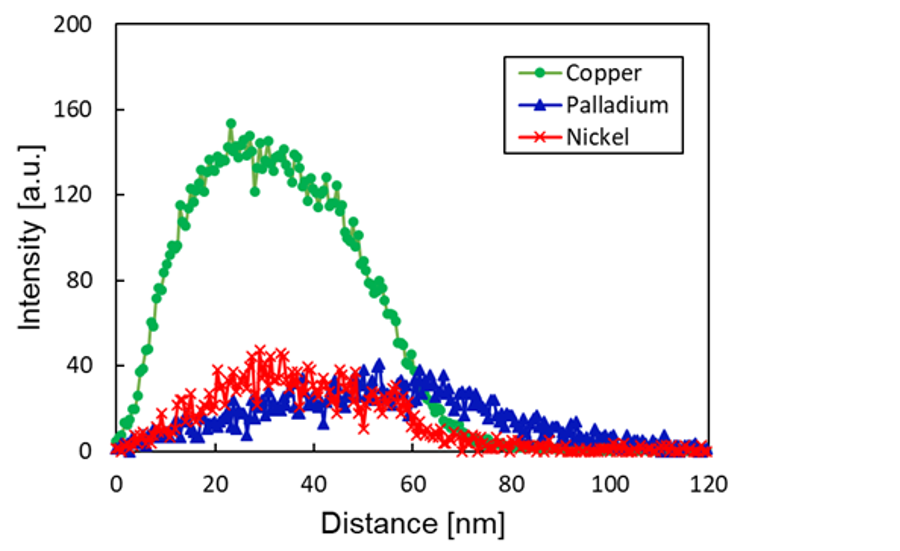 さらにFig.5 より,樹脂側の改質層下部においては,銅(以下,Cu)の析出がなく,Pd粒子のみ分布する領域が確認された。これは, Cuの析出反応がめっき液と接触した箇所から開始するためで,Cu粒子が析出した被膜より下部の改質層では,Cuで覆われめっき液が供給されなかったことを示唆していると考えられる。