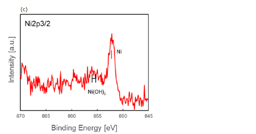 HAXPES測定によるC1s,Cu2p3/2,Ni2p3/2,およびPd3dの結果をFig.6 (a) ~ (d) に示す。Fig.6 (a)のC1sを見ると,CはC-C,C-H状態が主として存在し,金属と結合した状態は認められなかった。前報4)では,VUV処理後のCOPフィルムの表面状態をFT-IRで評価し,COO-などの酸素系官能基がフィルム表面に導入されていることを確認したが,めっき被膜の界面においても同様にCOO-起因とみられるスペクトル形状が確認できた。Fig.6 (b)のCu2p3/2から,Cuは金属あるいは一価の酸化状態を主として存在していると考えられる。Fig.6 (c)のNi2p3/2より,Niは金属状態が主として存在しているがNi(OH)2状態も存在すると考えられる。また,Fig.6 (d)のPd3dから,Pdは金属状態で存在していると考えられる。