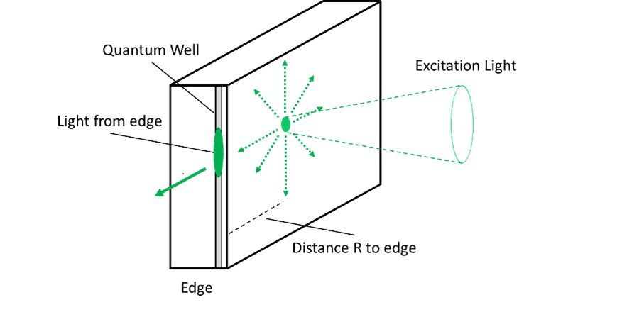 Figure 1 shows a schematic diagram to explain the principle of the waveguide loss measurement [7-8]. When excitation light is focused on the sample surface by object lens at the position where the distance from the sample edge is R, photoluminescence (PL) light propagates in the waveguide by distance R and emits from the edge. Since a part of the light is absorbed in the waveguide, the edge emission intensity and spectrum will depend on the distance R. The light absorption can be described by the following expression: