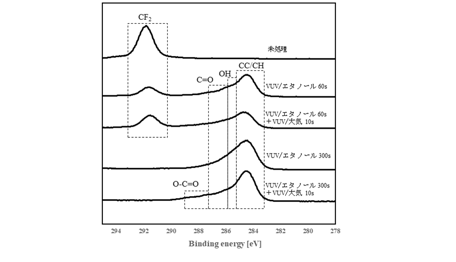 図1に示すXPS のC1sスペクトルにおいて、第一工程が60秒の場合CF2ピークが減少し、表面官能基ピークが検出された。300秒の場合CF2ピークは検出されなかった。300秒照射後に第二工程を行うことで酸素官能基COOHが出現した。