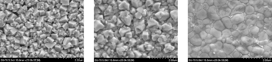 Figure 1に2step法TAおよびFLAによって作製した太陽電池セルのJ-V曲線を示す。TAのときの変換効率は7.48%であった。FLAのときは変換効率が最も高くなる照射条件で14.4%であり、TAよりもFLAの方が高い太陽電池性能が得られることが確認できた。それぞれのMAPbI3膜のSEM像をFigure 2に示す。TAは照射前と変わらずブロック結晶が積みあがった膜になっているのに対して、FLAでは緻密な膜が形成していることがわかった。このことより、TAよりもFLAの方が高い変換効率が得られたのは、キャリアの再結合が起こりやすい粒界が減少したことや、表面が平坦化したことに起因していると考えられる。結晶形成条件が最適化できていない膜に対してもFLAによって膜を緻密化できるため、より簡便な成膜法で高効率が得られることが期待できる。