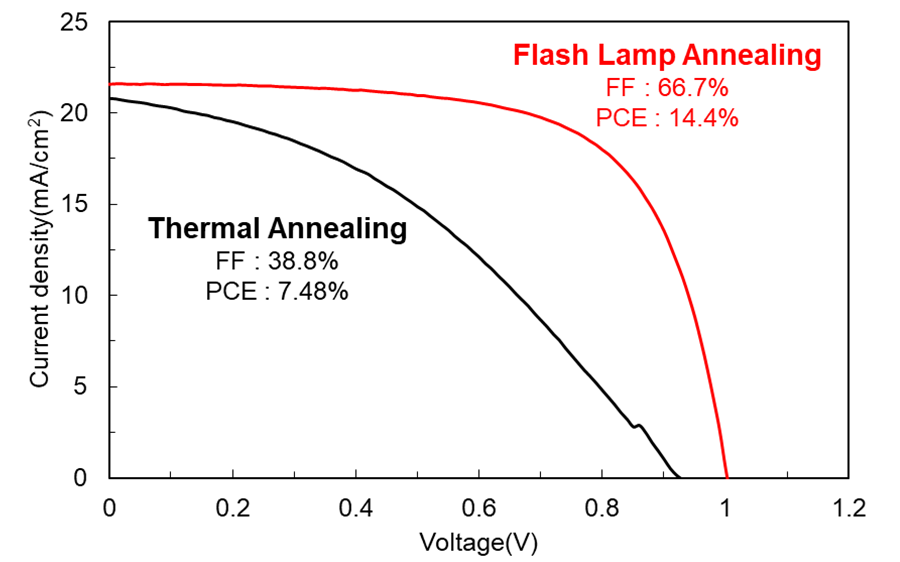 25mm角のGlass/FTO/c-TiO2/mp-TiO2上に、PbI2塗布後にMAI溶液に浸漬させる2step法によってMAPbI3膜を作製し、ホットプレートによる加熱焼成(TA)もしくはFLAによって処理した。フラッシュランプ照射装置には、ウシオ電機のSUS980を使用した。そこにSpiro-OMeTADとAgを積層し、それぞれの太陽電池の電流密度–電圧(J-V)特性を測定した。