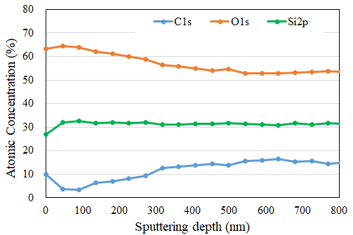 野尻らの研究2)を参考に,PC基板にプライマー(モメンティブ, SHP470FT-2050)とハードコート(モメンティブ,AS4700F)をコーティングしたサンプルを準備した.エキシマ照射装置(ウシオ電機,SVC232シリーズ)のステージにサンプルを載せて,酸素濃度を約1000 ppm,照射距離を5 mmに固定し,ステージ温度は25 ℃,50 ℃,75 ℃,100 ℃,120 ℃の5水準とし,VUV照射を行った.積算光量は1 J/cm2,2 J/cm2,3 J/cm2の3水準とし,所定の積算光量になるようにVUV照射時間を調整した.VUV照射によるハードコートの改質の程度を評価するために,VUV照射前後のサンプルについて,X線光電子分光(XPS)分析及びフーリエ変換赤外分光(FT-IR)測定を行った.XPS分析装置(ULVAC-PHI,Quantera Ⅱ)を用いて,ハードコートの改質層を含む深さ方向の元素比率を調べるために,Arイオンスパッタリング法で,ハードコートの深さ方向のC1s,O1s,Si2pの3元素の濃度比を測定した.フーリエ変換赤外分光光度計(日本分光,FT/IR-4600)を用いて,全反射減衰(ATR)法でハードコート表面の改質層の化学組成を調べた.