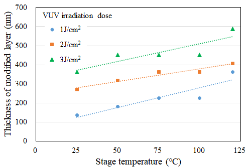 Fig.2 Relationship between stage temperature and thickness of modified layer