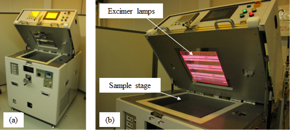 Fig.2 Excimer light irradiation device: Ushio SVC232 Series. The VUV irradiation part of photograph (a) is enlarged in (b).