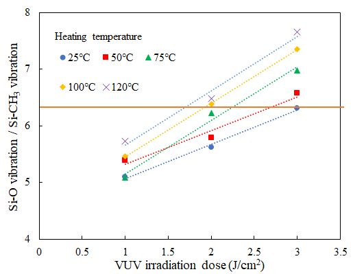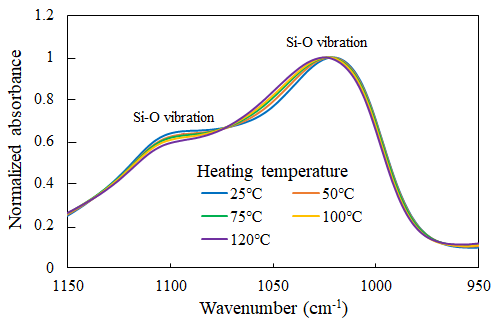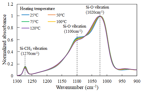 図3は,積算光量3 J/cm2で,加熱温度を25℃~120 ℃に変えたときのFTIR-ATRスペクトルを1020 cm-1付近のSi-O伸縮振動に由来するピークで正規化した結果である.図3(a)で,1100 cm-1付近と1270 cm-1付近は,それぞれ,Si-O伸縮振動とSi-CH3変角振動に由来するピークである.ただし,これらのピークは全てVUV照射で変化するため,規格化するピークとして適さないが,FTIR-ATRスペクトルの変化を見易くするために,敢えて1020 cm-1付近のピークで規格化している.加熱温度が高くなると,1270 cm-1付近のピークは低下しながらやや高波数側にシフトし(図3(b)),1100 cm-1付近のピークは低下しながら1020 cm-1付近のピークに収れんされ(図3(c)),無機ガラスのFTIR-ATRスペクトルに近づくことが確認された.